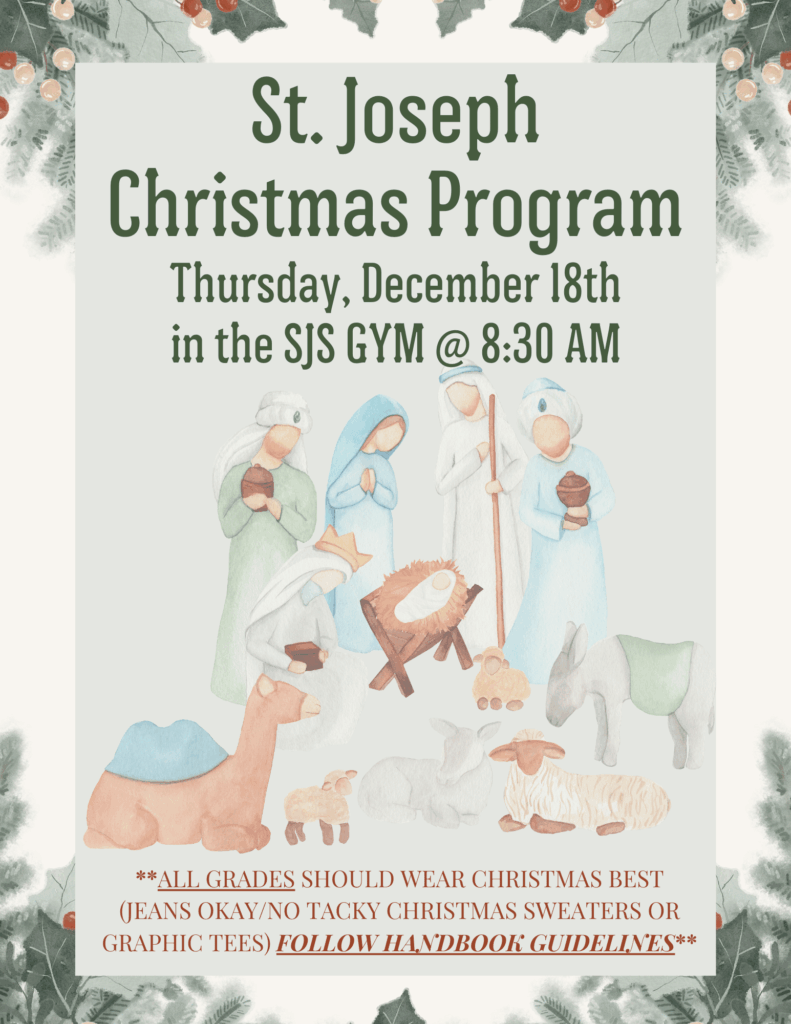 St. Joseph Catholic School is special because of the culture that is created- one of fellowship, one of support, one of being intentional about providing for our students. It happens when we all choose to do what is good and pleasing. Let us do so for all upcoming activities, whether it’s St. Nick’s Feast this coming Saturday, our annual Christmas Program, or completing the task of providing Christmas for the needy in our community. Let us gather for the good. St. Joseph, pray for us.